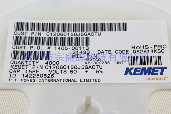 產(chǎn)品名稱:KEMET陶瓷電容 1206 50V 15PF C1206C150J5GACTU