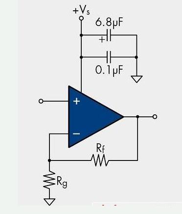圖8:一個(gè)單電源放大器示例 (如果使用雙電源放大器,則只需在其它電源上增加相同的旁路電容即可)。