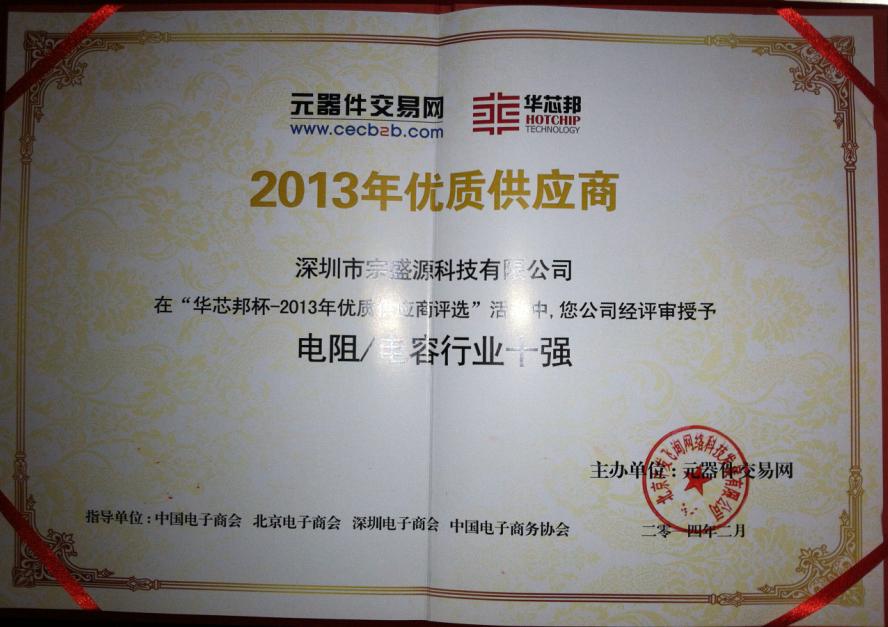 "華芯邦"杯-2013年優(yōu)質(zhì)供應(yīng)商十強(qiáng)選拔經(jīng)過二個(gè)月的激烈競(jìng)爭(zhēng),終于華麗落幕,宗盛源科技憑借優(yōu)質(zhì)的產(chǎn)品、周到的服務(wù)、低廉的價(jià)格榮獲"華芯邦"杯-2013年優(yōu)質(zhì)供應(yīng)商十強(qiáng)!