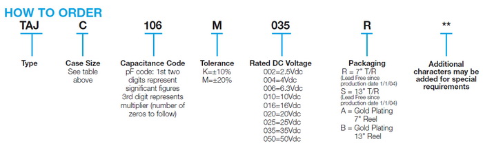 每個(gè)品牌都有自己獨(dú)立的物料編碼系統(tǒng),物料編碼的內(nèi)容可以準(zhǔn)確的體現(xiàn)出產(chǎn)品的信息,想要知道品牌物料的具體參數(shù)就必須了解每個(gè)編碼所表示的意思,現(xiàn)在我們就以AVX鉭電容為例子為大家講解下物料編碼所表達(dá)的含義。我們以AVX鉭電容下面的 TAJB106K020RNJ 型號為例子: