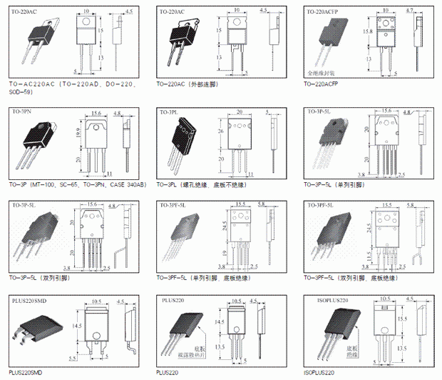 對(duì)于塑料封裝而言,三引腳的TO-220是基本形式,由此擴(kuò)大,有TO-3P、TO-247、TO-264等,由此縮小,有TO-126、TO-202等,并各自延伸出全絕緣封裝以及更多引腳封裝和SMD形式。其目的也很明確,在保證耗散功率的前提下縮小封裝成本,對(duì)于高頻開關(guān)器件,還要減小引線電感和電容,DirectFET封裝就是典型的例子。很多封裝僅從外部形狀來(lái)看,很相似,這時(shí)候就需要注意其實(shí)際的外形尺寸以及底板是否絕緣等;有些封裝不止一個(gè)名稱,因?yàn)榉庋b原本沒(méi)有統(tǒng)一的國(guó)際標(biāo)準(zhǔn),更多是約定俗成,后來(lái)一些行業(yè)協(xié)會(huì)也參與了名稱的確認(rèn)以便于交流,如常見的以SC開頭的封裝名稱就大多是由JEITA,日本電子和信息技術(shù)產(chǎn)業(yè)協(xié)會(huì)統(tǒng)一確認(rèn)的,對(duì)常見的TO-220AB,JEITA命名的名稱是SC-46。部分功率三極管的封裝形式見后圖。