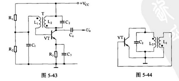 變壓器耦合振蕩器工作原理可用圖5-44說明:L2與C2組成的LC并聯(lián)諧振回路作為晶體管VT的集電極負(fù)載,VT的集電極輸出電壓通過變壓器T的振蕩線圈L2耦合至反饋線圈L1,從而又反饋至VT基極作為輸入電壓。由于晶體管VT的集電極電壓與基極電壓相位相反,所以變壓器T的兩個線圈L1與L2的同名端接法應(yīng)相反,使變壓器T同時起到倒相作用,將集電極輸出電壓倒相后反饋給基極,實現(xiàn)了形成振蕩所必須的正反饋。因為并聯(lián)諧振回路在諧振時阻抗最大,且為純電路,所以只有諧振頻率fo能夠滿足相位條件而形成振蕩,這就是LC回路的選頻作用。