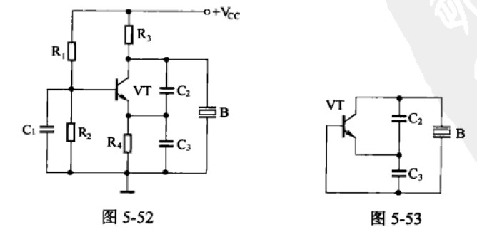 2.從圖5-53所示交流等效電路可見,這是一個電容三點式振蕩器,晶體B在這里等效為一個電感元件使用,與震蕩回路電容C2、C3一起組成并聯(lián)諧振回路,共同決定電路的振蕩頻率。
