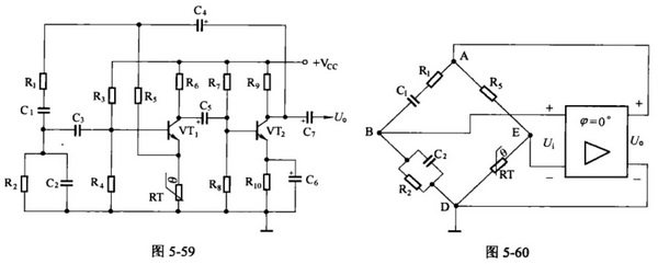 2.正反饋網(wǎng)絡(luò)和負反饋網(wǎng)絡(luò)正好構(gòu)成了電橋電路,如圖5-60所示。VT1、VT2組成相移角的放大器,電橋的A、D端接放大器輸出端,B、E端接放大器輸入端。當信號頻率等于R1、C1和R2、C2正反饋網(wǎng)絡(luò)的諧振頻率時,放大器輸出電壓Uo與反饋到輸入端的電壓Ui相同,電路振蕩。