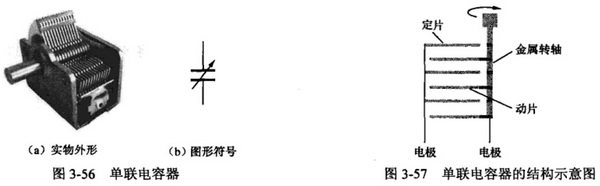電容器是由多個(gè)連接在一起的金屬片作定片,以多個(gè)與金屬轉(zhuǎn)軸連接的金屬片作動(dòng)片構(gòu)成。單聯(lián)電容器的實(shí)物和圖形符號(hào)如圖3-56所示。