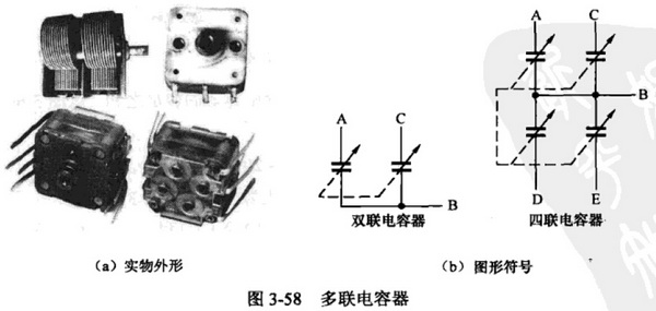 1.外形與圖形符號(hào)。多聯(lián)電容器是指將兩個(gè)或兩個(gè)以上的可變電容器結(jié)合在一起并且可同時(shí)調(diào)節(jié)電容器。常見(jiàn)的多聯(lián)電容器有雙聯(lián)電容器和四聯(lián)電容器,多聯(lián)電容器的實(shí)物外形圖形如圖3-58所示。