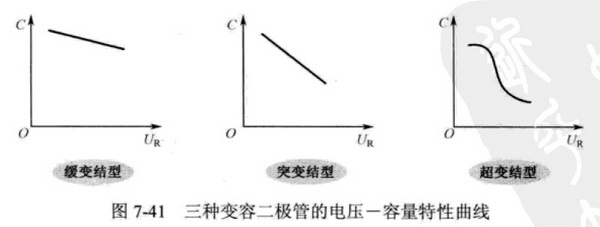 變?nèi)荻䴓O管按照PN結(jié)的結(jié)構(gòu)和結(jié)面附近雜質(zhì)的分布情況不同,可以分成緩變結(jié)、突變結(jié)和超變結(jié)三種類型,如圖7-41所示是三種變?nèi)荻䴓O管的電壓—容量特性曲線,圖中X軸方向變?yōu)樽內(nèi)荻䴓O管上的反向偏置電壓,Y軸方向?yàn)榻Y(jié)電容。