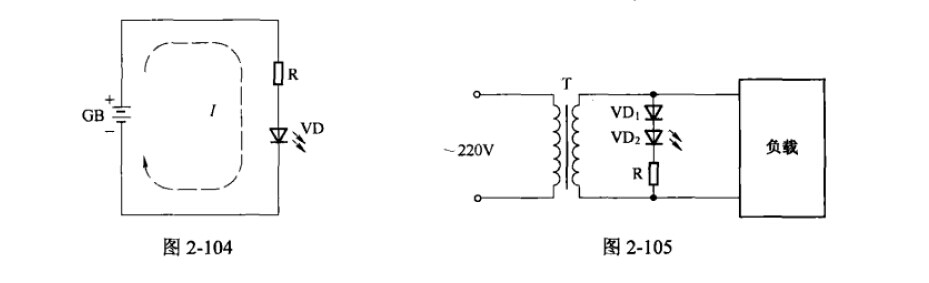 1、發(fā)光二極管用作指示電路。發(fā)光二極管的典型應(yīng)用電路如圖2-104所示,R為限流電阻,I為通過發(fā)光二極管的正向電流。發(fā)光二極管的管壓降一般比普通二極管大,約為2V,電源電壓必須大于管壓降,發(fā)光二極管才能正常工作。
