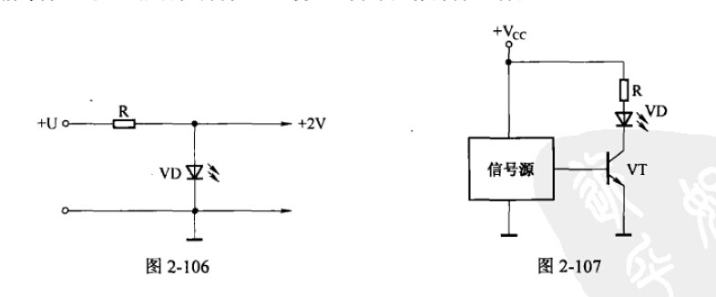 2、發(fā)光二極管可作為低電壓穩(wěn)壓二極管使用。圖2-106所示為簡單并聯(lián)穩(wěn)壓電路,利用發(fā)光二極管VD的管壓降,可提供+2V的直流穩(wěn)壓輸出。VD同時具有電源指示功能。