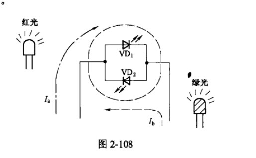 1、雙色發(fā)光二極管。它是將兩種發(fā)光顏色(常見的為紅色和綠色)的發(fā)光二極管管芯反向并聯(lián)后封裝在一起,如圖2-108所示。當(dāng)工作電壓為左正右負(fù)時,電流Ia通過管芯VD1使其發(fā)紅光;當(dāng)工作電壓為左負(fù)右正時,電流Ib通過管芯VD2使其發(fā)綠光。