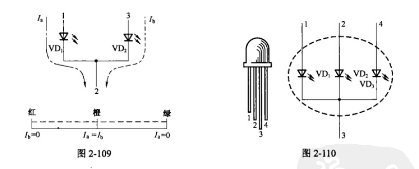 2、三引腳變色LED。它是將兩種發(fā)光顏色(通常為紅色和綠色)的發(fā)光二極管管芯負(fù)極聯(lián)系在一起作為公共負(fù)極,令兩引腳分別為紅色和綠色管芯的正極。電流Ia通過管芯VD1使其發(fā)紅光,電流Ib通過管芯VD2使其發(fā)綠光,電流Ia=Ib并同時通過管芯時LED發(fā)橙色光,當(dāng)Ia與Ib的比例不同時,LED發(fā)光顏色按比例在紅-橙-綠間變化,如圖2-109所示。