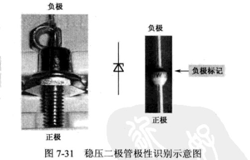 識別穩(wěn)壓二極管的各引腳有下列兩種方法:(1)通過穩(wěn)壓二極管外形特征和管殼上的各種標(biāo)記,可以識別各種穩(wěn)壓二極管的正、負(fù)引肝鄧。例如,有的穩(wěn)壓二極管上直接標(biāo)出圖形符號,塑料封閉的穩(wěn)壓二極管有標(biāo)記的一端為負(fù)極,金屬封裝穩(wěn)壓二極管半圓面的一端為負(fù)極,平面的一端為正極,如圖7-31所示。(2)用萬用表來檢測的方法。穩(wěn)壓二極管也是一個PN結(jié)的結(jié)構(gòu),所以運(yùn)用萬用表歐姆擋測量PN結(jié)的正向和反向電阻可以分辨正、負(fù)引腳。