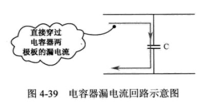 根據(jù)電容器的結(jié)構(gòu)可知,電容器兩極極板之間是高度絕緣的,理想情況下不能通過(guò)電流。但是,任何絕緣體都不是理想的絕緣體,或多或少地存在著電阻,兩極之間總會(huì)有電荷穿過(guò)絕緣物質(zhì),只不過(guò)數(shù)量很少而已,這樣電容器兩端加上電壓后就會(huì)有電流流過(guò)電容器的兩根引腳,稱為電容器的漏電流,如圖4-39所示是電容器漏電流回路示意圖。