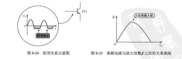后級放大器的三極管靜態(tài)電流較大,這樣,三極管放大倍數(shù)B可以較大,放大能力較強,同時可以防止輸入信號進入三極管截止區(qū),因為后級放大器的信號幅度已經(jīng)較大了,對于NPN型三極管而言,其輸入信號負半周峰值部分將會進入三極管截止區(qū),產(chǎn)生削頂失真,如圖8-24所示。