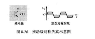 大信號的甲類放大器中,如果推動級放大管工作點在交流負載線中間,那么非線性失真會最小,如圖8-26所示。這是因為在正、負半周對稱削頂?shù)那闆r下,信號的非線性失真小于非對稱(如大小頭失真,正半周削頂量大于負半周削頂量)時的非線性失真。