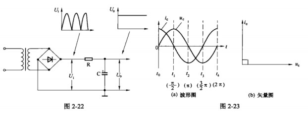(3)移相。由于通過(guò)電容器的電流大小取決于交流電壓的變化率,因此電容器上電流超前電壓90度,具有移相作用,如圖2-23所示。利用電容器上電流超前電壓的特性構(gòu)成的RC移相網(wǎng)絡(luò)如圖2-24所示。圖2-24(a)中,輸出電壓U0取自電阻R,由于電容器C上電流I超前輸入電壓U1,因此U0超前U1一個(gè)相移角,