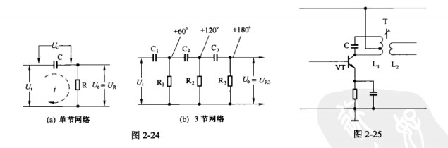 在0-90度,由R、C的比值決定。當(dāng)需要的相移角超過(guò)90度時(shí),可用多節(jié)移相網(wǎng)絡(luò)來(lái)實(shí)現(xiàn)。圖2-24(b)所示為3節(jié)RC移相網(wǎng)絡(luò),每節(jié)移相60度,3節(jié)共移相180度。