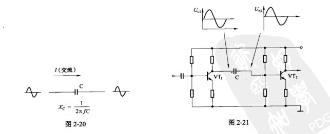 (1)信號(hào)耦合。電容器可以將前級(jí)電路的交流信號(hào)耦合至后級(jí)電路。圖2-21所示為兩級(jí)音頻放大電路,晶體管VT1集電極輸出的交流信號(hào)通過(guò)電容C傳輸?shù)絍T2基極,而VT1集電極的直流電位則不會(huì)影響到VT2基極,VT1與VT2可以有各自適當(dāng)?shù)闹绷鞴ぷ鼽c(diǎn),這就是電容器的耦合作用。