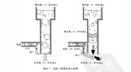 可以看到,水閘側(cè)面流過很小的水流流量(相當(dāng)于電流IB),就可以控制水閘上方(相當(dāng)于電流IC)流下的大水流流量。這就相當(dāng)于晶體三極管的放大作用,如果水閘側(cè)面沒有水流流過,就相當(dāng)于基極電流IB被切斷,那么水閘閘門關(guān)閉,上方和下方就都沒有水流流過,相當(dāng)于集電極(C)到發(fā)射極(E)的電流也被關(guān)斷了。