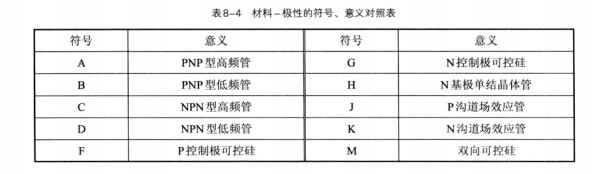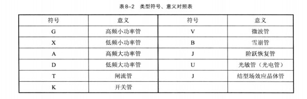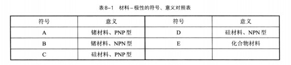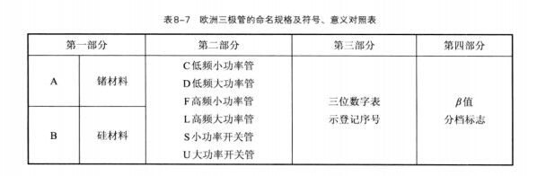 對于歐洲生產的三極管,命名規(guī)格見表8-7所列。