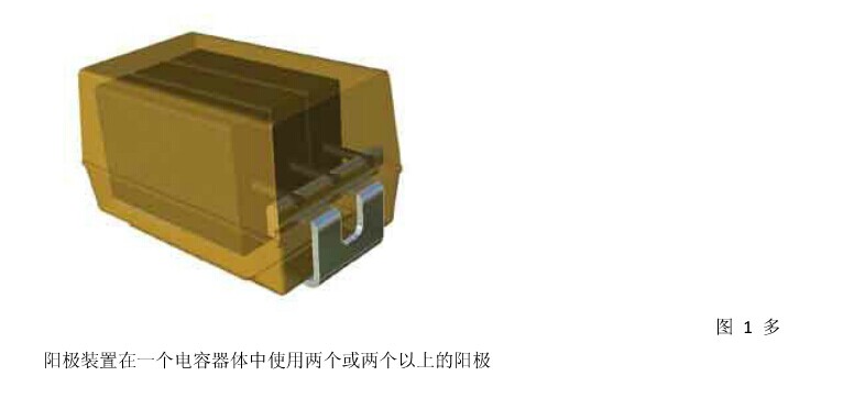 當(dāng)今市場(chǎng)上常用的鉭多陽(yáng)極通常采用縱向排列3-5個(gè)陽(yáng)極于一個(gè)電容體內(nèi)的方法實(shí)現(xiàn),如圖1所示。這實(shí)際是從制造的角度來(lái)看的,如果從ESR的角度,此解決辦法則不如橫向布局,橫向布局中更薄的平板陽(yáng)極有望進(jìn)一步減小ESR。