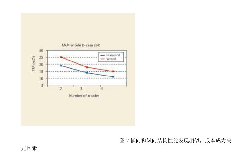 橫向和縱向結(jié)構(gòu)兩者ESR性能之間的差異如圖2所示。這個(gè)例子是基于對(duì)D類(lèi)電容器的理論計(jì)算,圖2表明,兩陽(yáng)極橫向結(jié)構(gòu)與三陽(yáng)極系統(tǒng)的縱向結(jié)構(gòu)的ESR值相似。然而,相對(duì)而言橫向結(jié)構(gòu)在ESR上性?xún)r(jià)比優(yōu)勢(shì)更顯著。