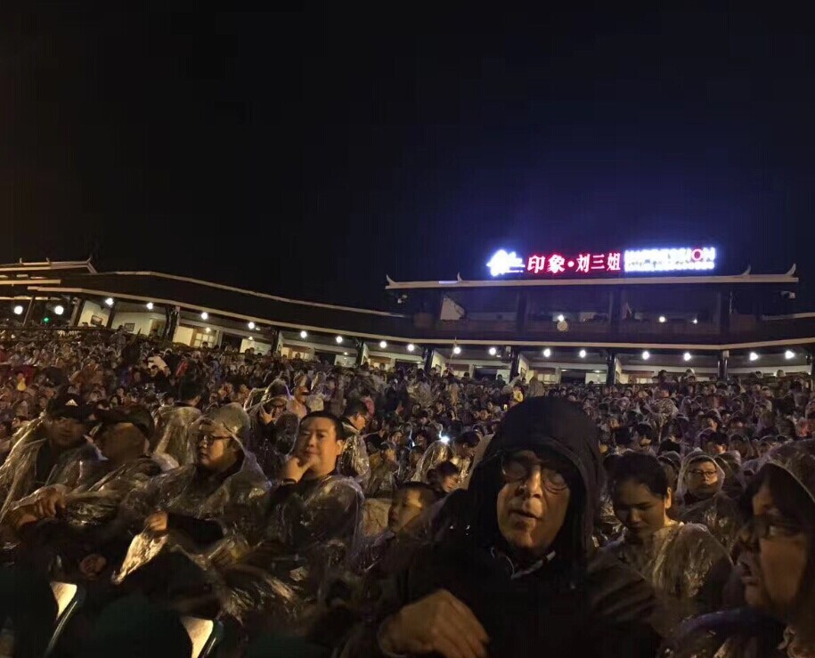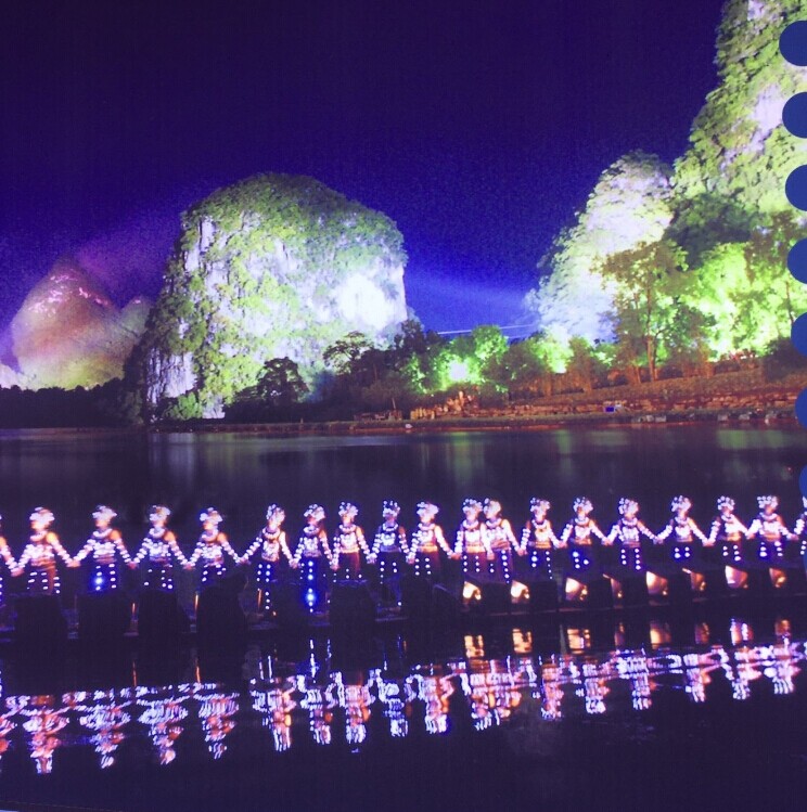 第二日我們便早早驅(qū)車,前往陽(yáng)朔,去到了蝴蝶泉、大榕樹(shù)。但凡到了陽(yáng)朔,自然不會(huì)錯(cuò)過(guò)“老謀子”張藝謀導(dǎo)演的大型水上實(shí)景演出《印象劉三姐》,印象劉三姐每天晚上都會(huì)準(zhǔn)時(shí)在陽(yáng)朔之外的漓江上拉開(kāi)演出的大幕,據(jù)說(shuō)演出場(chǎng)場(chǎng)爆滿,座無(wú)虛席。一到演出場(chǎng)外,只見(jiàn)游客們大呼小叫,組織的、入場(chǎng)的、招呼集體的黑壓壓全是人頭,果然座無(wú)虛席。那真實(shí)的景致、場(chǎng)面的宏大、色彩的艷麗、音響的震撼、美侖美奐,讓所有觀眾為之鼓掌叫好。